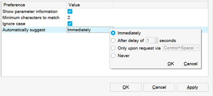 The options to trigger completions can be defined in the Preferences dialog. Figure 6.