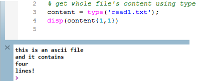content = type('read1.txt'); disp(content{1,1})You may find read1.txt under <install/tutorials/.