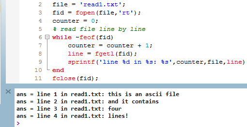 file = 'read1.txt'; fid = fopen(file,'rt'); counter = 0; % read file line by line while ~feof(fid) counter = counter + 1; line = fgetl(fid); sprintf('line %d in %s: %s',counter,file,line) end fclose(fid);This returns: