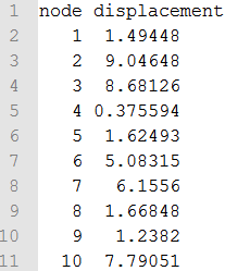 fid = fopen('read2.txt','wt'); fprintf(fid,'%4s %8s\n','node','displacement'); for i = 1:100 fprintf(fid,'%4d %8s\n',i,num2str(rand*10)); end fclose(fid);Open read2.txt, created in OML, and you’ll notice the format looks like this: