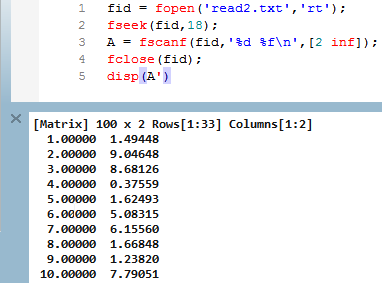 A'is the same as the one just saved in read2.txt. To breakdown this script:fseek(fid,18) is used to update the file pointer so as to jump the first line in read2.txt.
