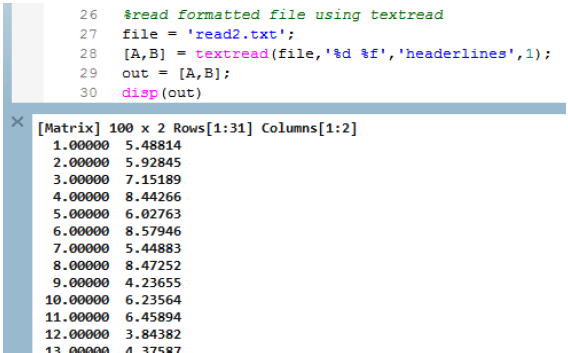 You can also use textread to fulfill the same job as fscanf, as shown in the example below: