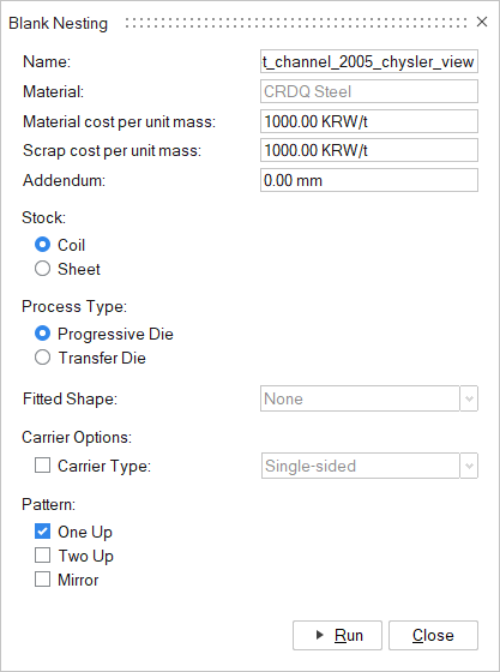| Two-up | This option allows you to nest two instances of the part on a coil or sheet metal so that every stroke of press will produce two identical parts. ![]() |
