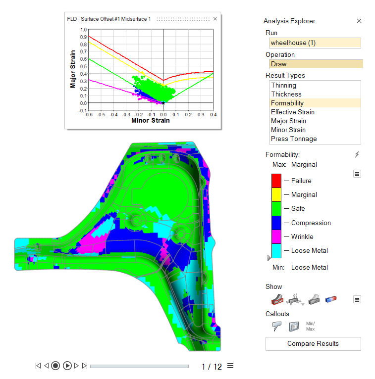 The Analysis Explorer window opens.- To view the blank flattening, on the slider below the model, click the