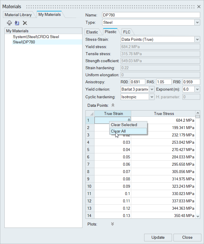 - Click the Data Points button to expand the columns for True Strain and True Stress.
