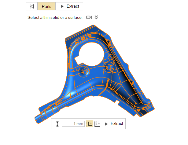The original thin solid is hidden and deactivated. When the midsurface is created, a thickness is automatically calculated and assigned to the part, and can be viewed in the Property Editor.