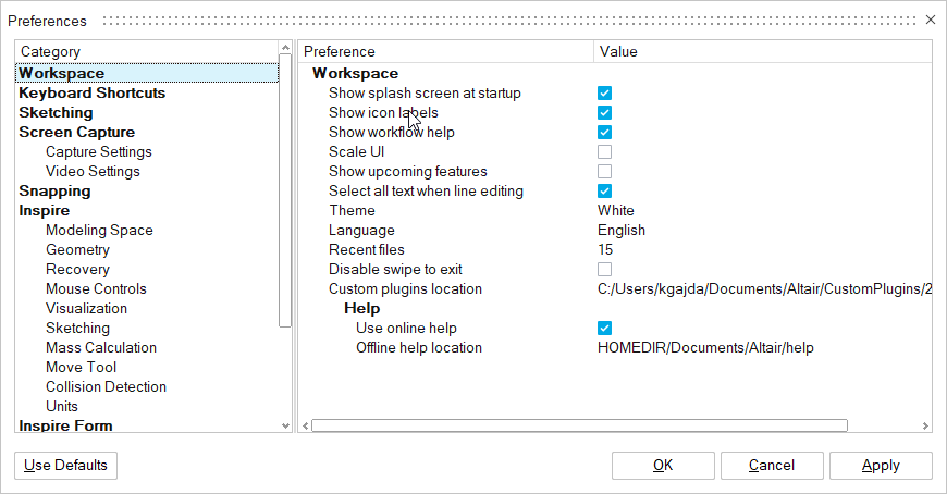 Modify the workspace display, default keyboard shortcuts, and other settings.
