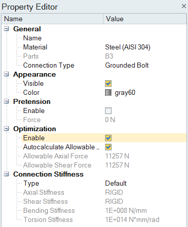 Based on the yield stress and the area of the hole Inspire automatically determines the maximum stress allowed for the fastener or cylindrical hole support. Deselect Autocalculate Allowable Forces to enable manually entry of the Allowable Axial Force.
