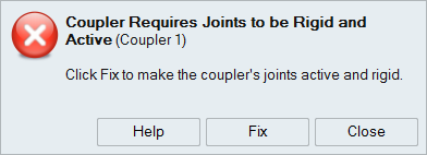 A warning message is displayed, noting that couplers require joints to be rigid and active.