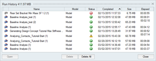 Once you have viewed an analysis run, it is removed from the Run Status window but can be viewed using the Run History table.
