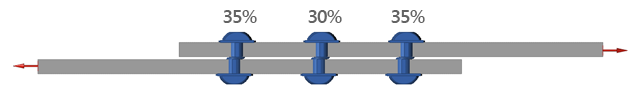 For real fasteners, the actual load carried will be somewhere between these limit values. For example, 30% on the center rivet and 35% on each of the outer rivets.