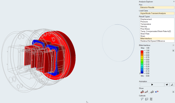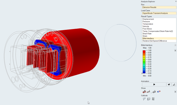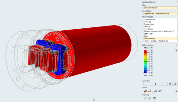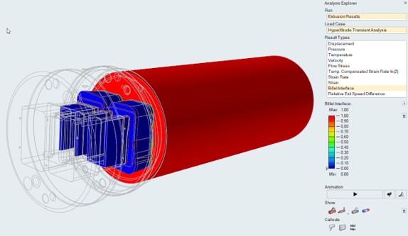When extruding multiple billet cycles, the new billet material welds with material left in the pockets and feeder plate from previous extrusions. The quality of the material in this zone may not be acceptable and is usually sheared off. This sheared-off region, known as butt length, can be computed by performing billet interface tracking analysis in HyperXtrude. Billet interface tracking is performed as a transient analysis.
