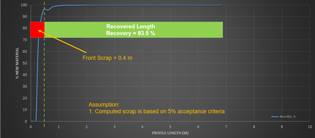 During Ram acceleration time, no new material is present on the exit surface. As extrusion progresses, the percentage of new billet material on the exit surface increases. After 6.85 seconds of extrusion (7th time step), the exit surface contains all new material.