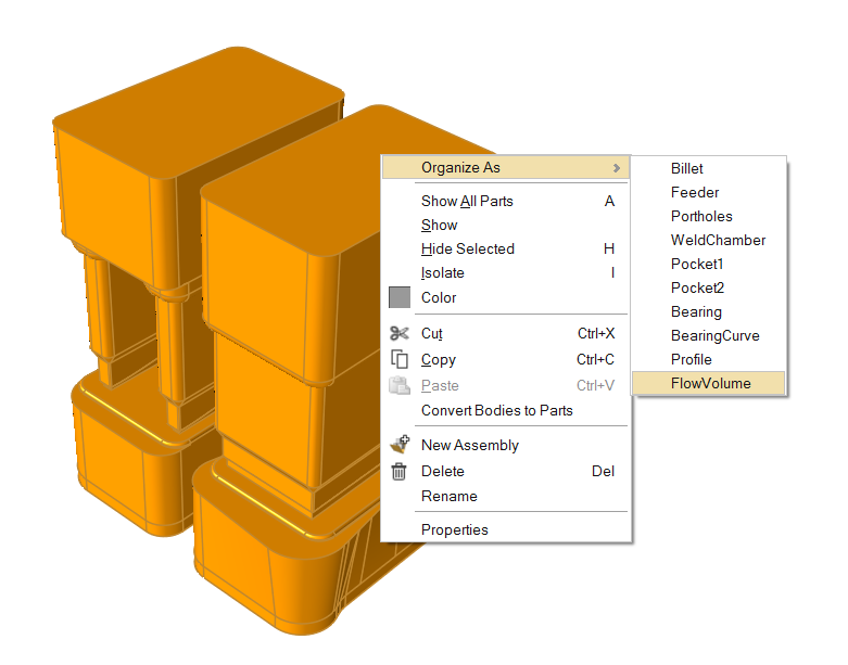 2. Right-click on either selected solid and click Organize As > FlowVolume.