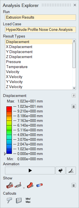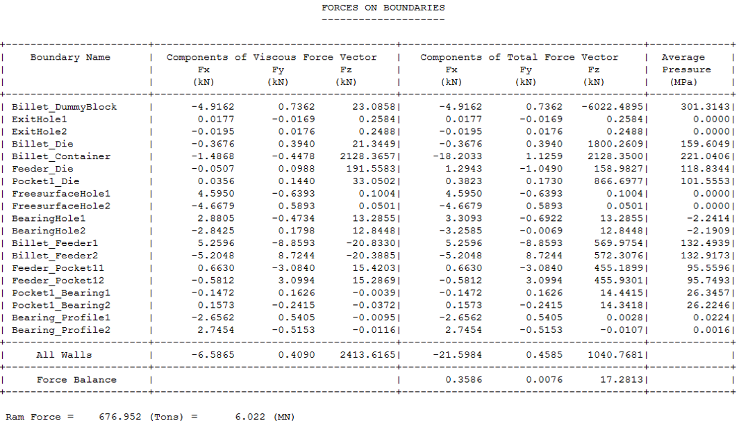 The pressure at the ram end provides the extrusion force required to push the billet. This data also provides information on the resulting extrusion loads on the die surfaces and can be used to predict tool deflection.