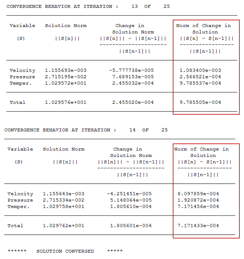 The solution is considered "converged" if the value of Norm of Change in Solution is less than tolerance (0.001) for all of the variables.