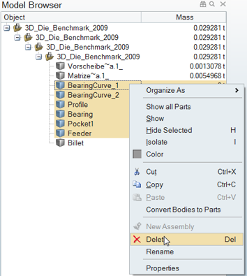 This model contains two tool components, the feeder plate and die plate, as well as workpiece components that are not required for tool deflection analysis. Those components should be deleted before proceeding.
