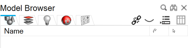 The Model Browser appears as a column on the left side of your design space. Toggle among multiple tabs to customize your field of view: World, Layers, Lights, Materials, and Drawing. Use the topics listed below to familiarize yourself with the various icons and their capabilities to develop a workflow that suits your design preferences.