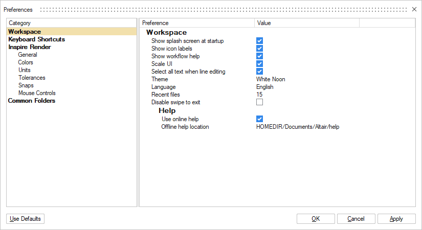 ワークスペース表示やデフォルトのキーボードショートカットなどの設定を変更します。