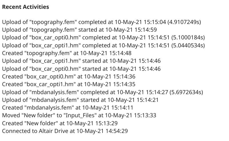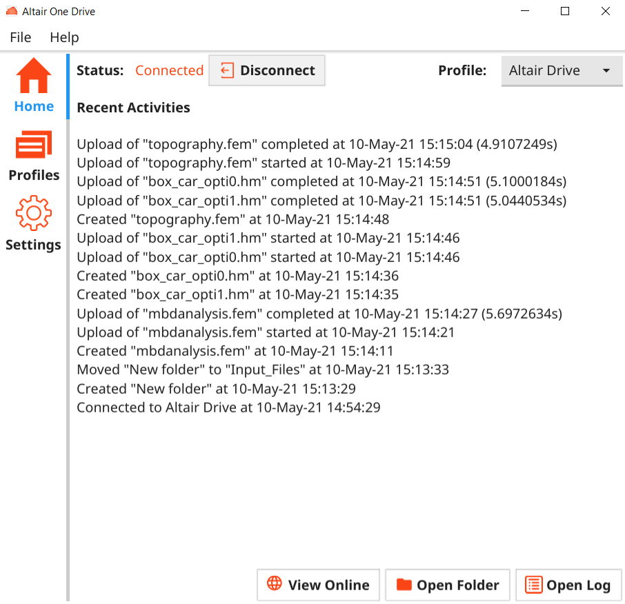 The application Home tab provides an option to connect to Altair One, view recent activities, launch Altair Drive Web application, open Altair One Drive files location in Windows Explorer and view the preferred log details.