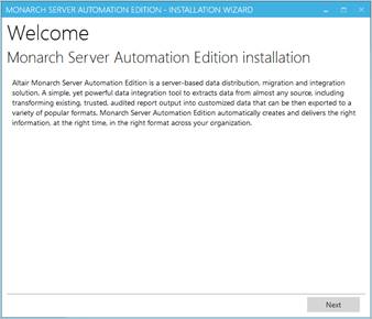 1. In the directory with the installation files, double-click MonarchAutomatorInstaller.exe to launch the Monarch Server Automation Edition Installation Wizard.