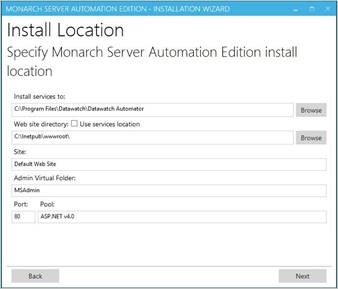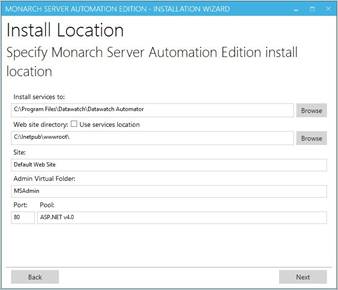 b. In the Web site directory field, specify the site name where the web applications are to be installed. If you select the Use services location check box, the web application (Admin) will be installed in the Monarch Server Automation Edition directory.