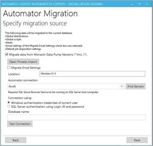 Select Migrate data from Monarch Data Pump Version 7 thru 11 and specify the following migration settings: