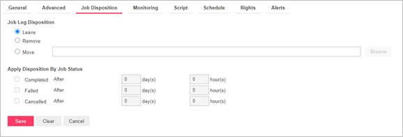 If we had chosen to delete or move the job logs, we would then specify Apply Disposition by Job Status settings. For information on these settings, refer to the Specifying Job Log Disposition Settings topic in the web help. In addition, we would need to specify a Custodian schedule which is responsible for implementing the job log disposition settings.