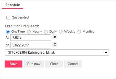 NOTES If we needed to run the process on a hourly, daily, weekly, or monthly basis we could select the corresponding option. For detailed information about execution frequency settings, refer to the "Execution Frequency" topic in the web help. |