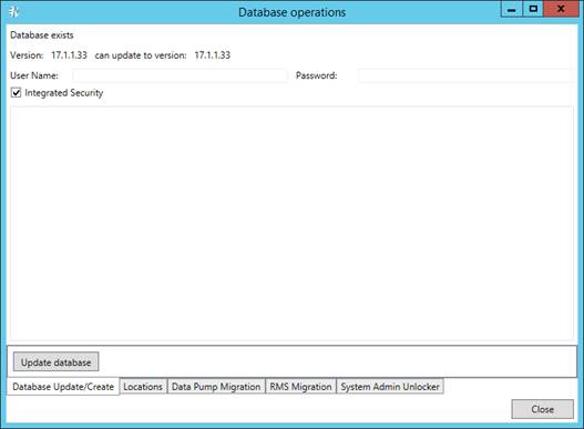 Select the Integrated Security check box to use Windows Authentication. The specified user must have system administrator rights to update database. |