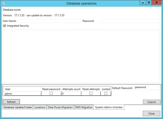 Select the Integrated Security check box to use Windows Authentication. The specified user must have system administrator rights to update the database. |
