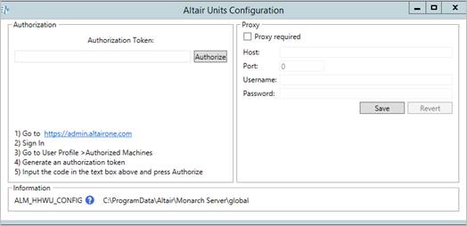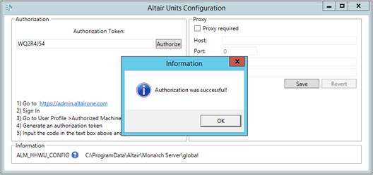 e. In the Altair Units Configuration dialog, enter the Auth Code you generated in Step iii and then click Authorize.