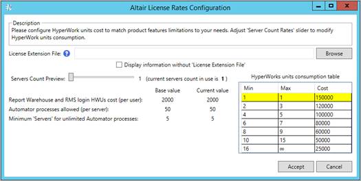 h. In the Altair License Rates Configuration window, you can adjust the Server Count Rates slider to modify the unit consumption.