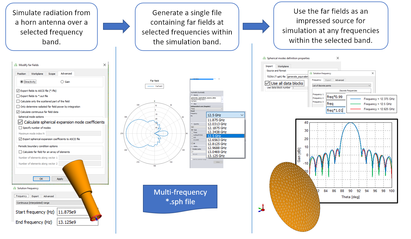• All file formats used in far field based impressed sources and receiving antenna requests were extended to support multi-frequency data. When used to define an impressed source, automatic interpolation of this source data allows it to be used for simulation at any frequency, enabling more flexible and dramatically simplified model-decomposition workflows.