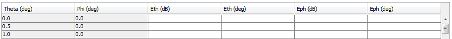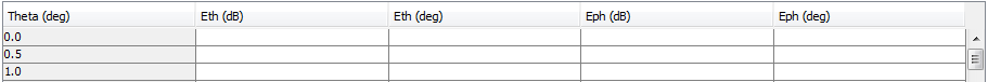 The attribute Theta describes the angle in degrees, Etheta (dB) and EPhi (dB) describe the module and Etheta(deg) and EPhi(deg) the phase values.