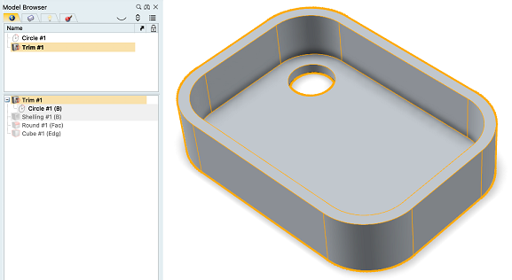 The Model Browser displays the construction history of an object in a tree. Like a real tree, the parent, root nodes are at the bottom of the tree, and the child nodes, like branches, are on the top.