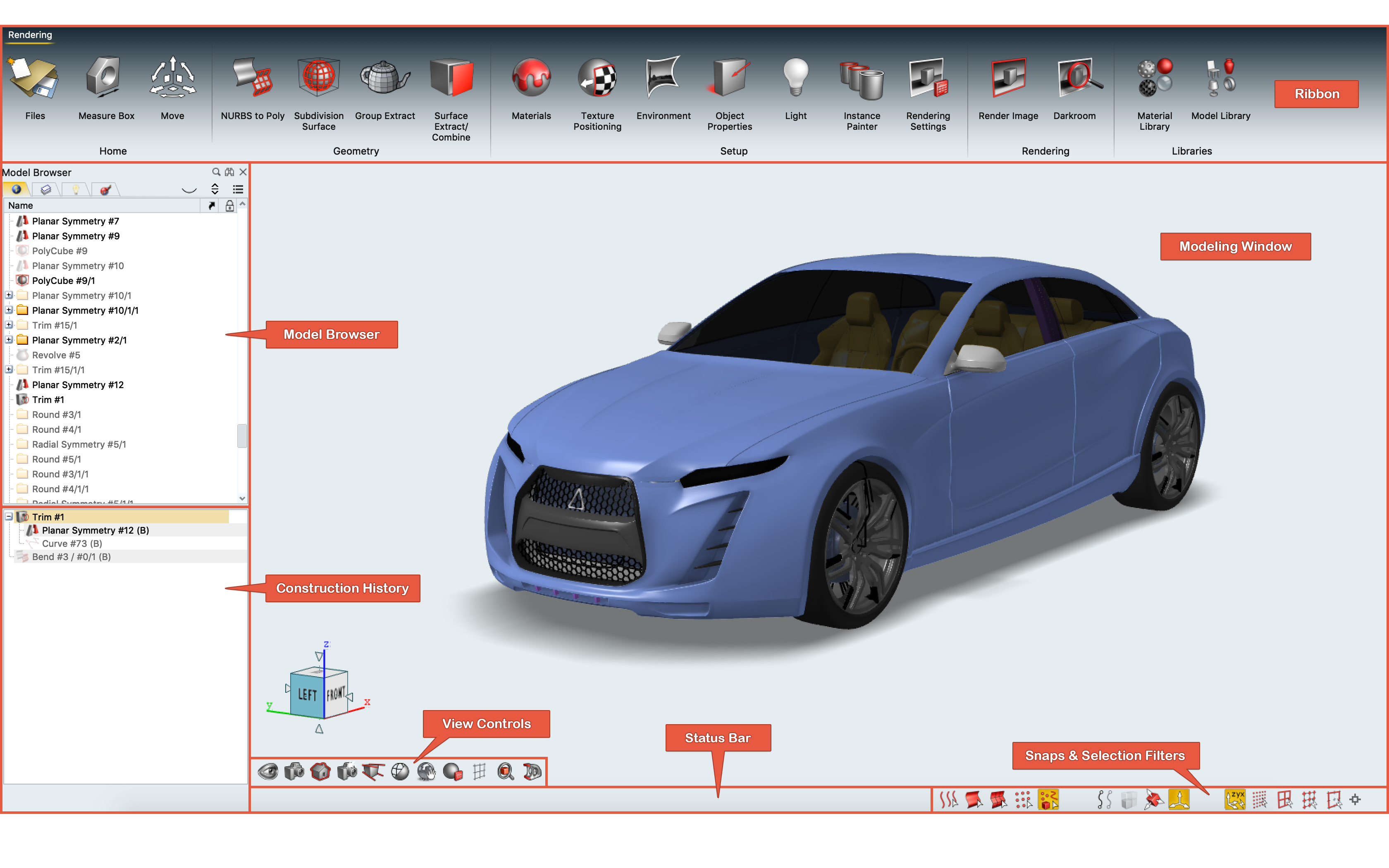 Inspire Renderワークスペースには、リボン、モデリングウィンドウ、モデルブラウザ、ステータスバーがあります。