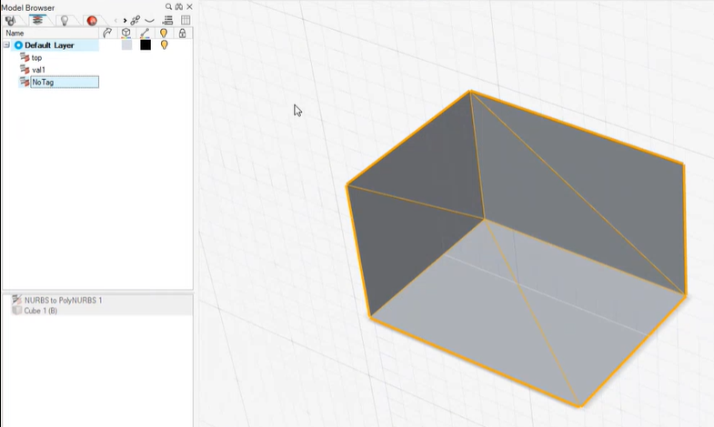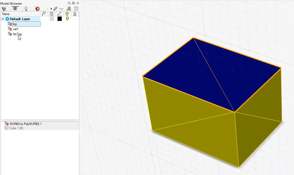 たとえば、上面フェイスと2つの側面フェイスは、タグ名は同じですが、タグ値が異なります。上面(タグ値top)は青で表示され、topレイヤーに配置されます。2つの側面(タグ値val1)は黄色で表示され、val1レイヤーに配置されます。