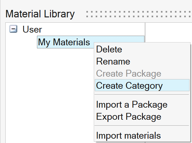 ユーザーマテリアルライブラリの整理 固有のマテリアルパッケージとカテゴリを作成してユーザーマテリアルライブラリを整理します。ユーザーマテリアルライブラリには、保存したカスタムマテリアルが入っています。 リボンで、レンダリングタブをクリックします。 マテリアルライブラリアイコンをクリックします。 マテリアルライブラリダイアログが表示されます。 ユーザーを右クリックします。 パッケージの作成をクリックします。 パッケージの名前を入力します。 パッケージを右クリックし、カテゴリの作成をクリックします。 マテリアルをカテゴリに追加するには、目的のマテリアルをカテゴリにドラッグします。 ダイアログボックスで、コピーをクリックします。 これで、マテリアルはパッケージに入ります。