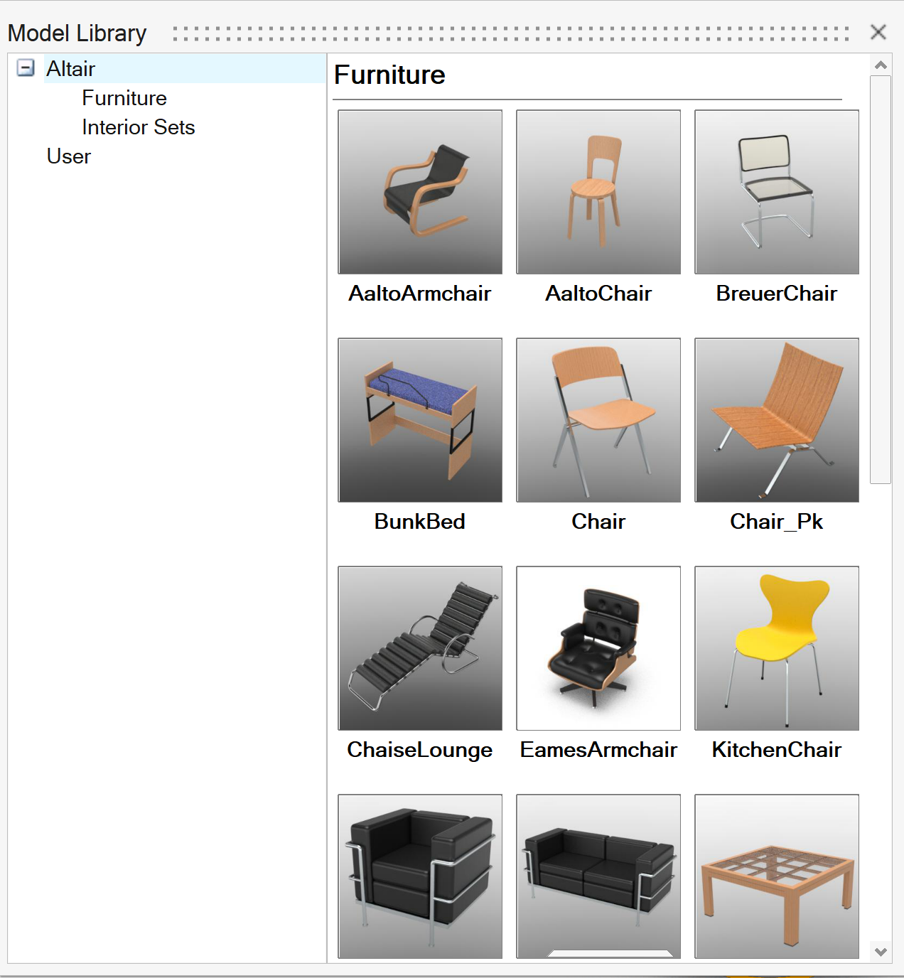 モデルライブラリを使用して、インタラクティブレンダリングでモデルとセットをシーンに適用します。デフォルトオブジェクト、またはユーザー作成のアップロードしたオブジェクトを参照し、アイテムをダブルクリックしてシーンに挿入します。