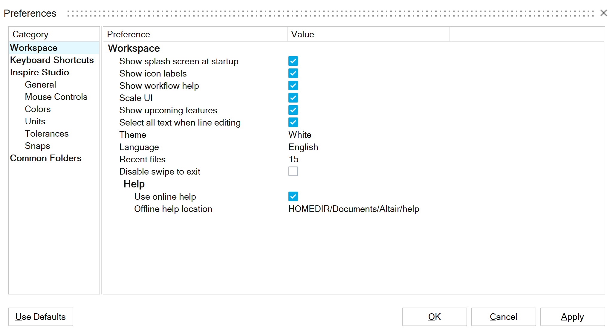 ワークスペース表示やデフォルトのキーボードショートカットなどの設定を変更します。
