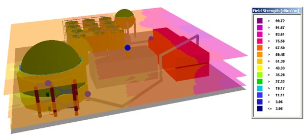 Wave propagation predictions can be done for horizontal prediction planes as well. The area to be predicted, the resolution of the results as well as the height(s) of the prediction planes can be defined on the Prediction tab of the System Configuration dialog. The results which have been selected to be computed and stored to the disk can be displayed in 2D view and 3D view using the File Browser.