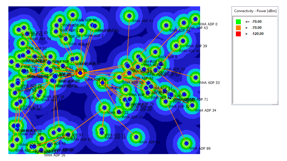 There are 98 transceivers placed at random locations in the forest. The node density in certain clutter classes was specified whereby CoMan generated and distributed the nodes.