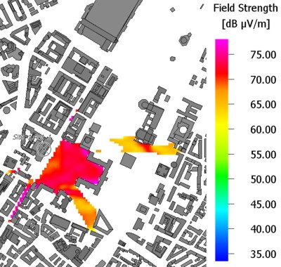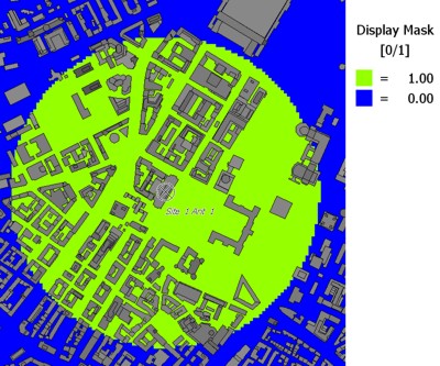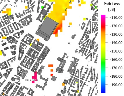 This example shows a path loss result which was masked with a clutter / morpho mask in order to keep only those result pixels belonging to the clutter class “open”.