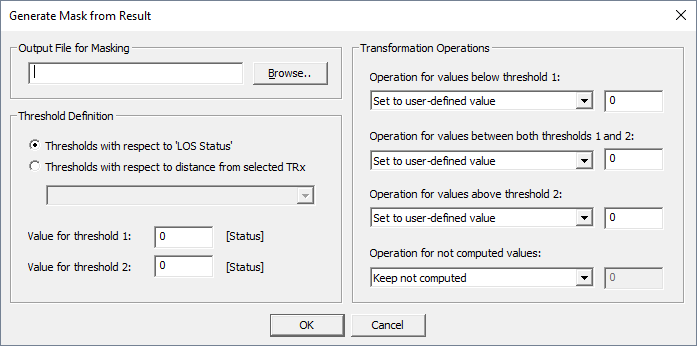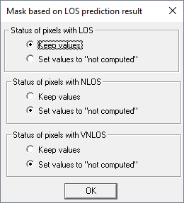 This option allows you to mask result data according to predicted line-of-sight conditions. After selecting a predicted LOS result a dialog opens where the status of the pixels for each LOS condition can be specified either to be set to “Set values to "not computed"” or Keep values.