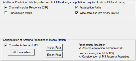 Note that the Propagation Paths check box is also selected to save the propagation paths during the regular propagation part of the simulation. This is automatic when you select the Consider Antenna of MS check box because the algorithm has to know, at every potential receiver location (at every pixel in the result plot), from which directions the signals are arriving. Only then can the receiver antenna pattern be included properly.