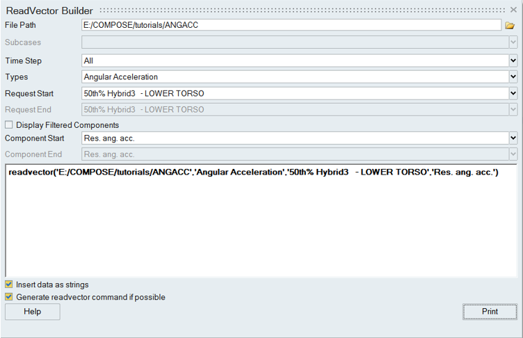 Using the Print button, the command readvector('<installation_directory>/tutorials/ANGACC','Angular Acceleration','50th% Hybrid3 - LOWER TORSO','Res. ang. acc.') is produced and can now be used in either the OML command window or a script.