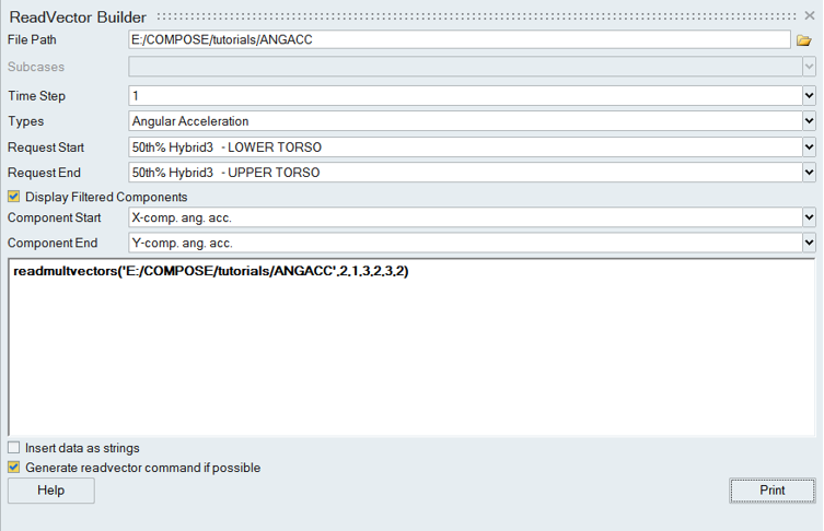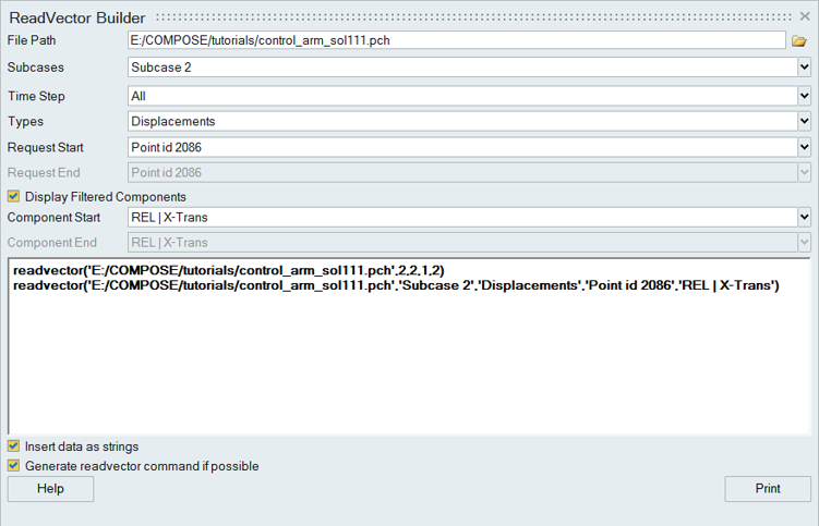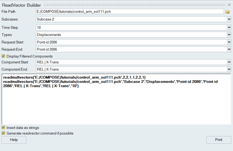 readvectorbuilder is a utility tool that reads CAE results/data files supported by Compose. It helps you create the right readvector() and readmultvectors() commands. The tool opens a dialog that can be used to select results files and navigate into the subcases, time steps, types, requests, and components contained in the selected file. Upon making your selections and selecting Print, the appropriate OML command (using either the readvector or readmultvectors command) is displayed.