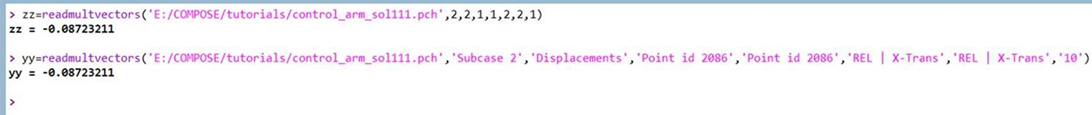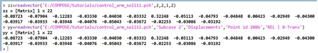 In Compose, these commands extract the displacement along 'REL | X-Trans' of node 'Point id 2086' in the second subcase of this result file: