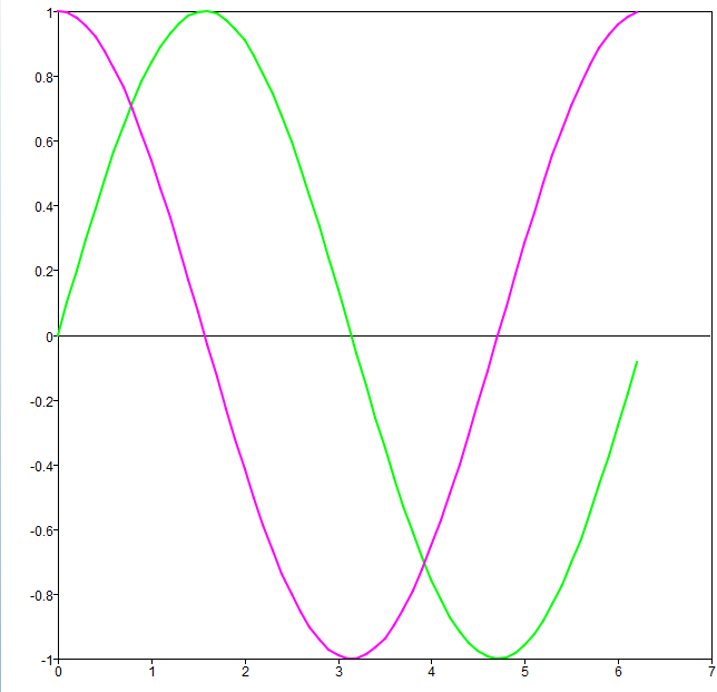 plot(x, sin(x), 'g', x, cos(x), 'm');